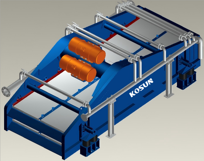 西安科迅LS1850振動篩采用三相異步振動電機作為振動源,由兩臺電機外拖作反向自同步旋轉(zhuǎn),是篩體沿直線做周期性往復運動,從而達到固液分離目的。雙層篩分設計,能夠有效細分物料,其篩網(wǎng)總面積達到18㎡(每層9㎡),確保了物料在篩網(wǎng)上有充足的停留時間,從而實現(xiàn)高效的篩分效果。