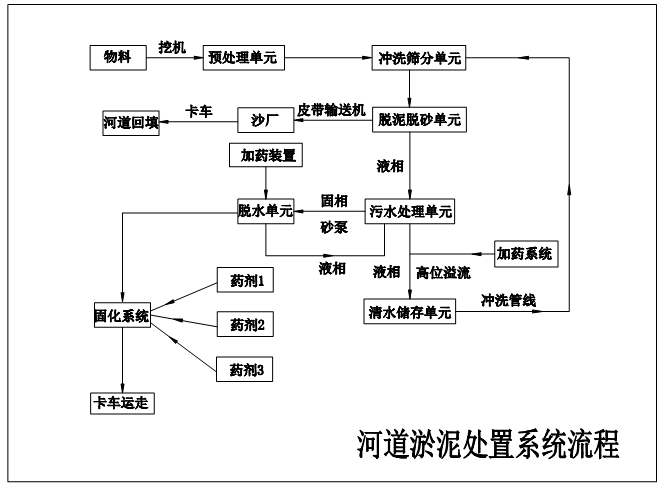 物料通過預(yù)處理工序后,進入沖洗篩分工序處理,含固液相進入脫泥脫沙工序,除去的沙石進入堆放區(qū),含固液相進入下一級快速沉降工序,最后根據(jù)物料的不同特征,液相進入污水處理單元處理后進入循環(huán)水儲存單元,底泥進入脫水工序,進行脫水減容和無害化、穩(wěn)定化處理。最終,尾水處理達標(biāo)后,排放或者拉運至污水處理廠,清潔砂達標(biāo)后回填河道,脫水底泥進行無害化處理后,拉運指定地點填埋或者資源化利用。